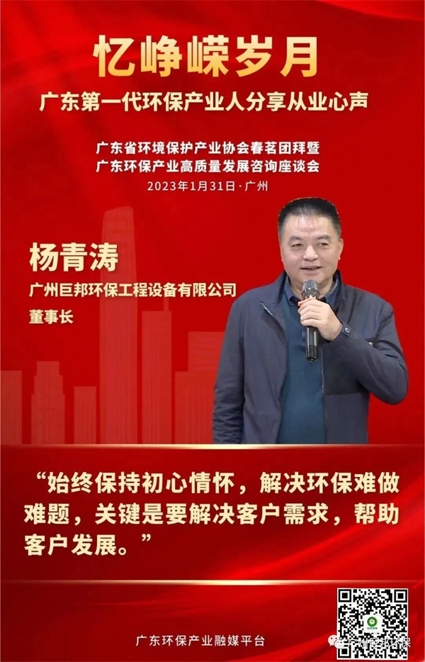 巨邦公司作為廣東省老字號環(huán)保企業(yè),楊青濤董事長作為第一代的環(huán)保產(chǎn)業(yè)人,于此團(tuán)拜會上分享了28年以來的從業(yè)心聲。